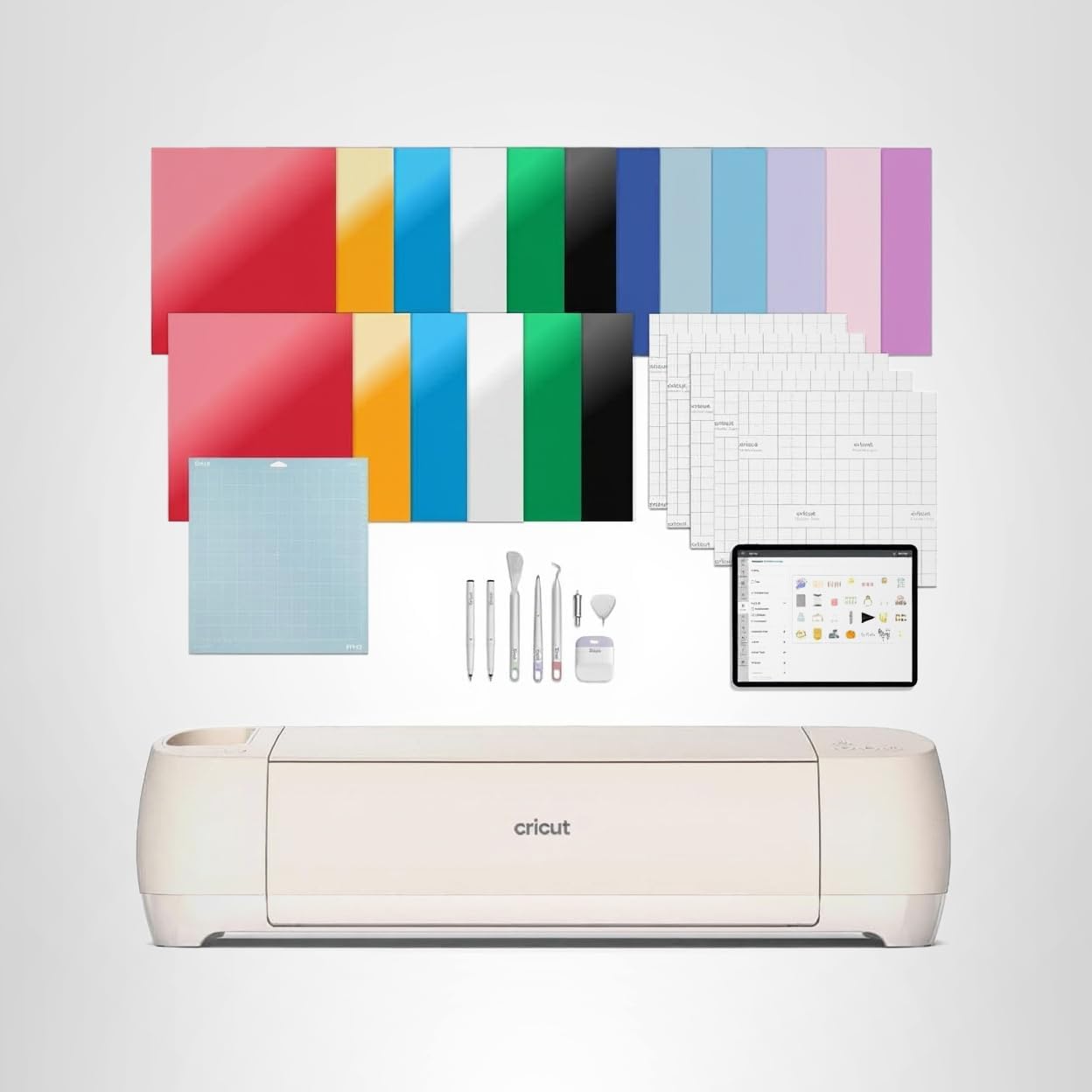 - ESSENTIALS BUNDLE: Also includes Cricut Essentials Bundle – 6 sheets of Smart Vinyl (13×12″), 6 sheets of cardstock (12″x12″), 5 sheets of transfer tape, 6 sheets of Smart Iron On HTV (13″x12″), StandardGrip Machine Mat, 4 Tools (Weeder, Scraper, Spatula, Scoring Stylus), & 2 Fine-Point Pens