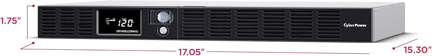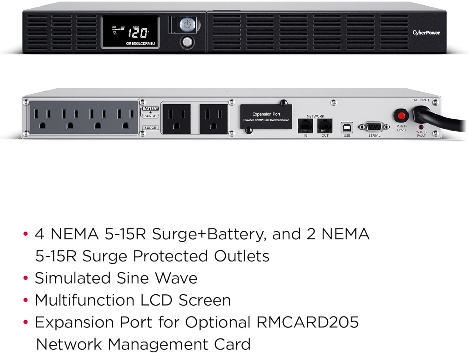 CyberPower OR1000LCDRM1U Smart App LCD UPS Battery Backup and Surge Protector, 1000VA/600W, 6 Outlets, AVR, 1U Rackmount, UL Certified