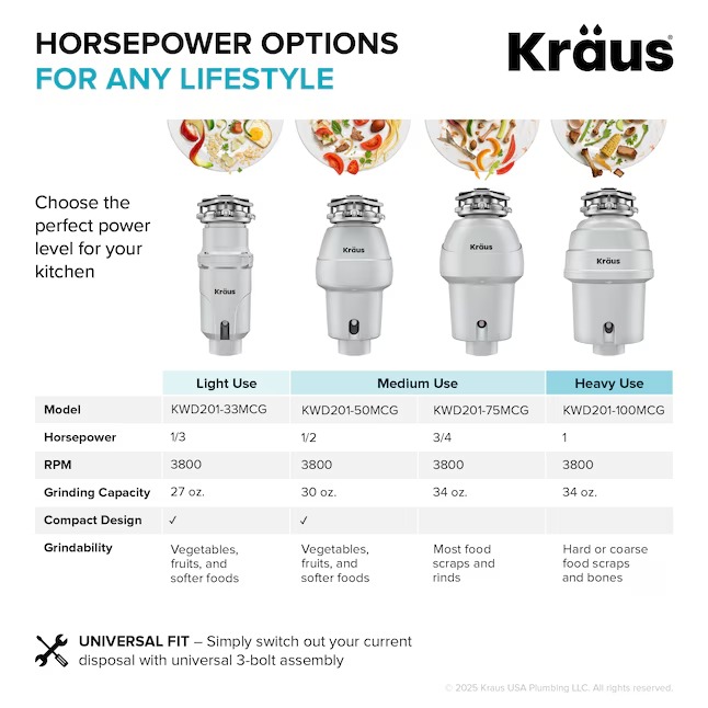 Make cleanup easy with a KRAUS WasteGuard Garbage Disposal, featuring a 3800 RPM MagnaGrind motor for fast, powerful operation. Available in 1/3 to 1 HP models for everything from light use to heavy-duty cleanup. Continuous-feed design lets you add waste while the sink disposal is running so you can clean as you go. Durable metal grinding components, QuietStorm soundproofing, and anti-vibration system help ensure lasting, quiet performance. Automatic shut-off with reset button protects motor during jams. Universal 3-bolt mounting with included power cord for plug-in installation or optional hardwiring. Garbage disposal for kitchen sinks comes with power cord, flange, and stopper/plunger. Septic-safe and eco-friendly, these garbage disposers help reduce the use of plastic trash bags.