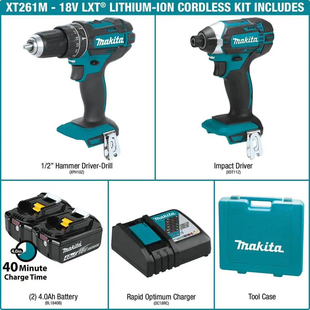 - Includes: 18-Volt LXT 1/2 in. hammer driver-drill (XPH10Z), 18-Volt LXT impact driver (XDT11Z), two 18-Volt LXT lithium-ion 4.0Ah batteries (BL1840B), 18-Volt lithium-ion rapid optimum charger (DC18RC), plastic tool case (824812-5)