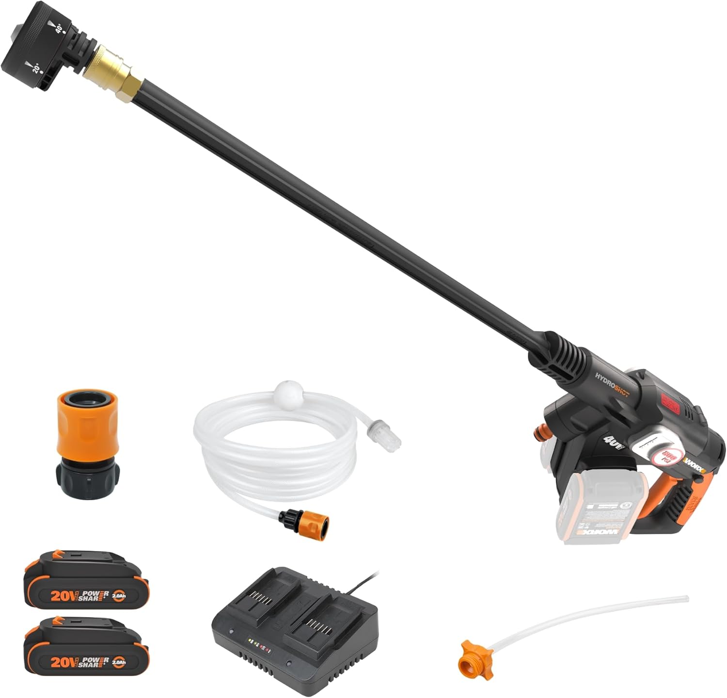 The WORX 40V Brushless Hydroshot Portable Power Cleaner is the beefier version of the popular standard Hydroshot model. Powered by the Brushless Motor 2.0, 800 MAX PSI with 1.0 GPM is delivered to effortlessly remove grime from surfaces and flush debris from large areas. Designed compact and portable, at only 5.3 lbs, you can take it anywhere you need. 2 pressure settings quickly adjust between high and low pressure to provide the best force for various applications. Five settings, from 0° for the most direct spray, to 15°, 25°, and 40° for a wider cleaning radius. You can use it to wash cars, windows, bicycles, boats, outdoor equipment, garages, etc, especially recommended for removing stubborn dirt. It draws water from any source, including bottles, buckets, pools, lakes even sea water. New to PowerShare? This unique battery platform lets you use 20V, 40V and 80V tools with the same batteries and charger.